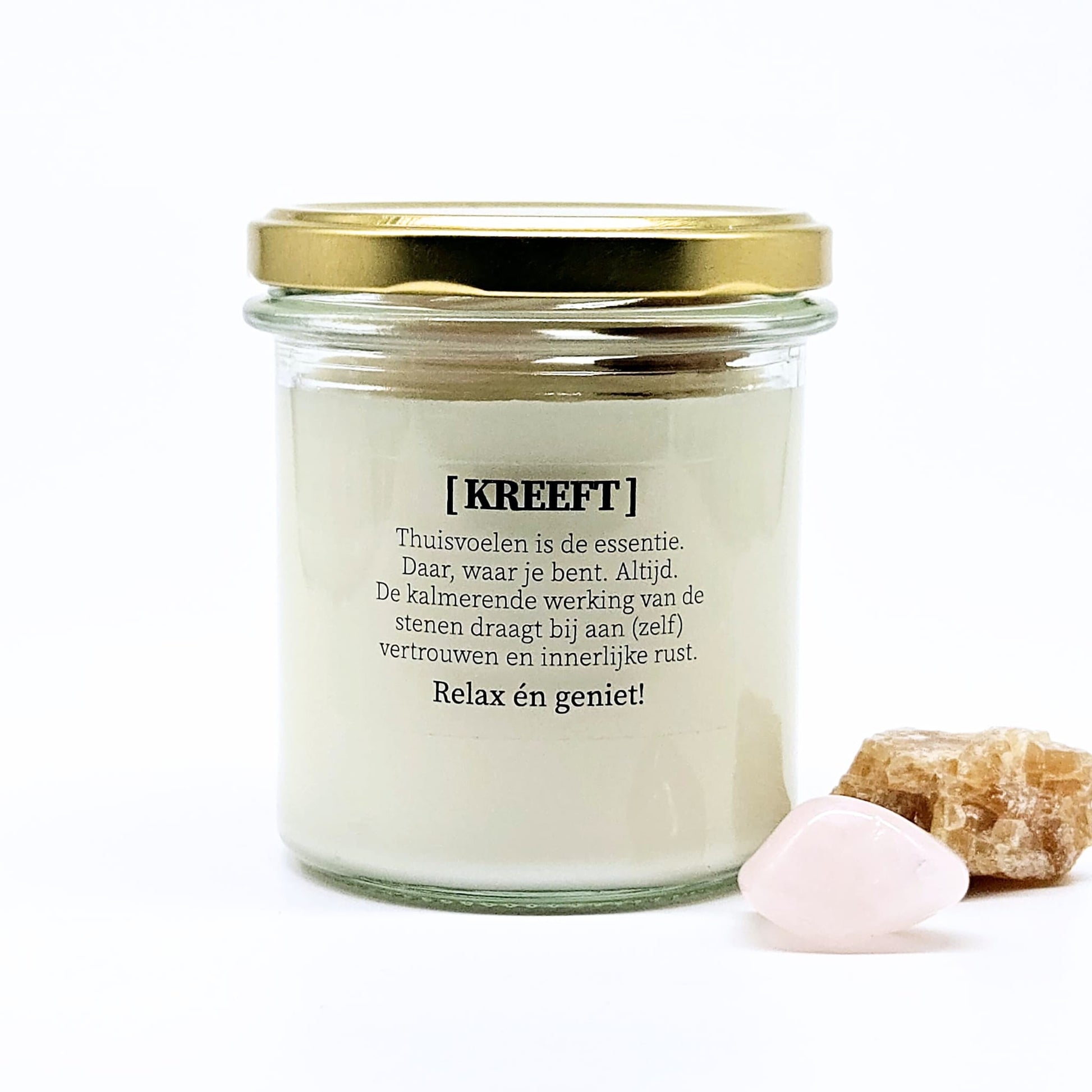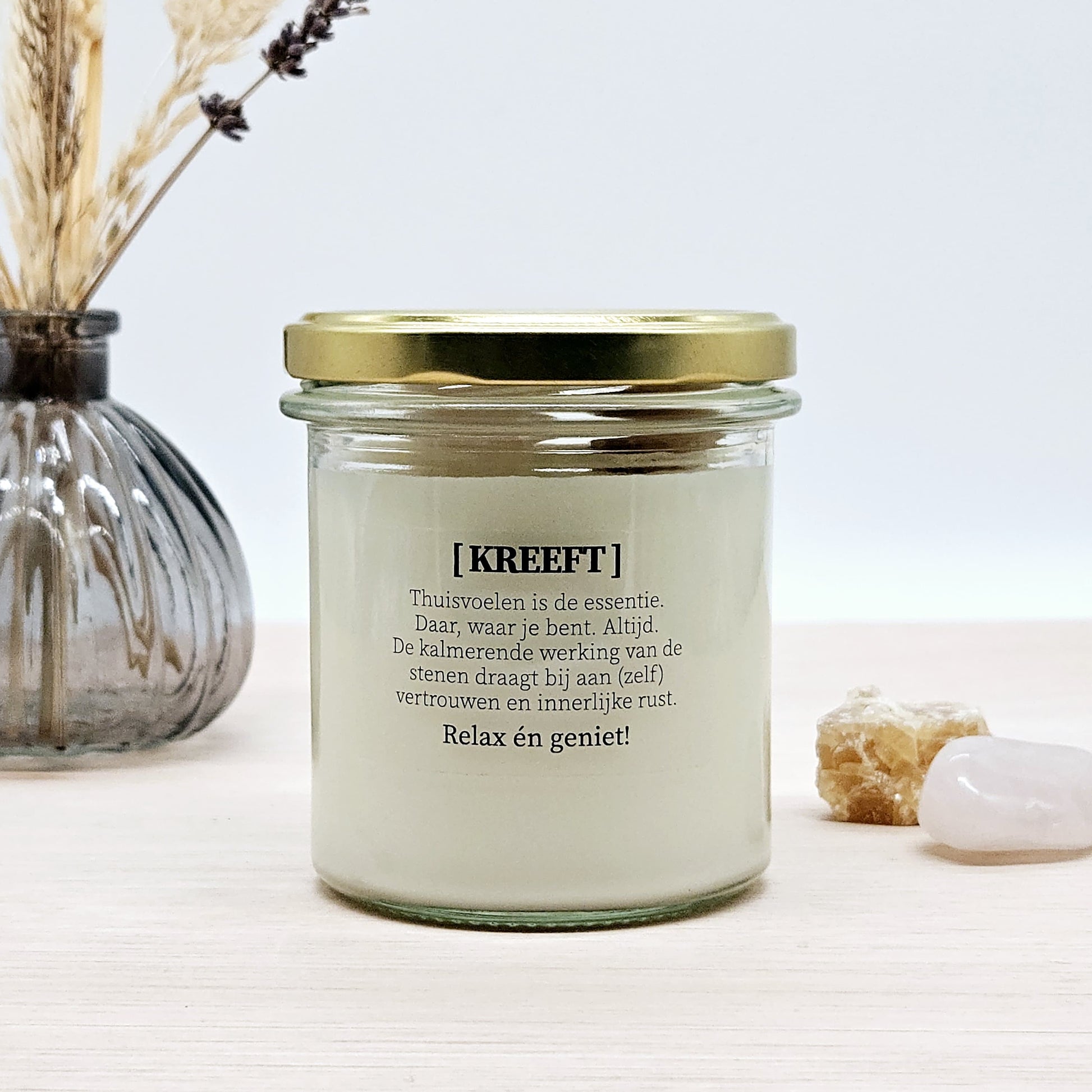 Deze geurkaars met edelstenen past bij jouw sterrenbeeld en is handgemaakt op basis van etherische olie en natuurlijke sojawas.