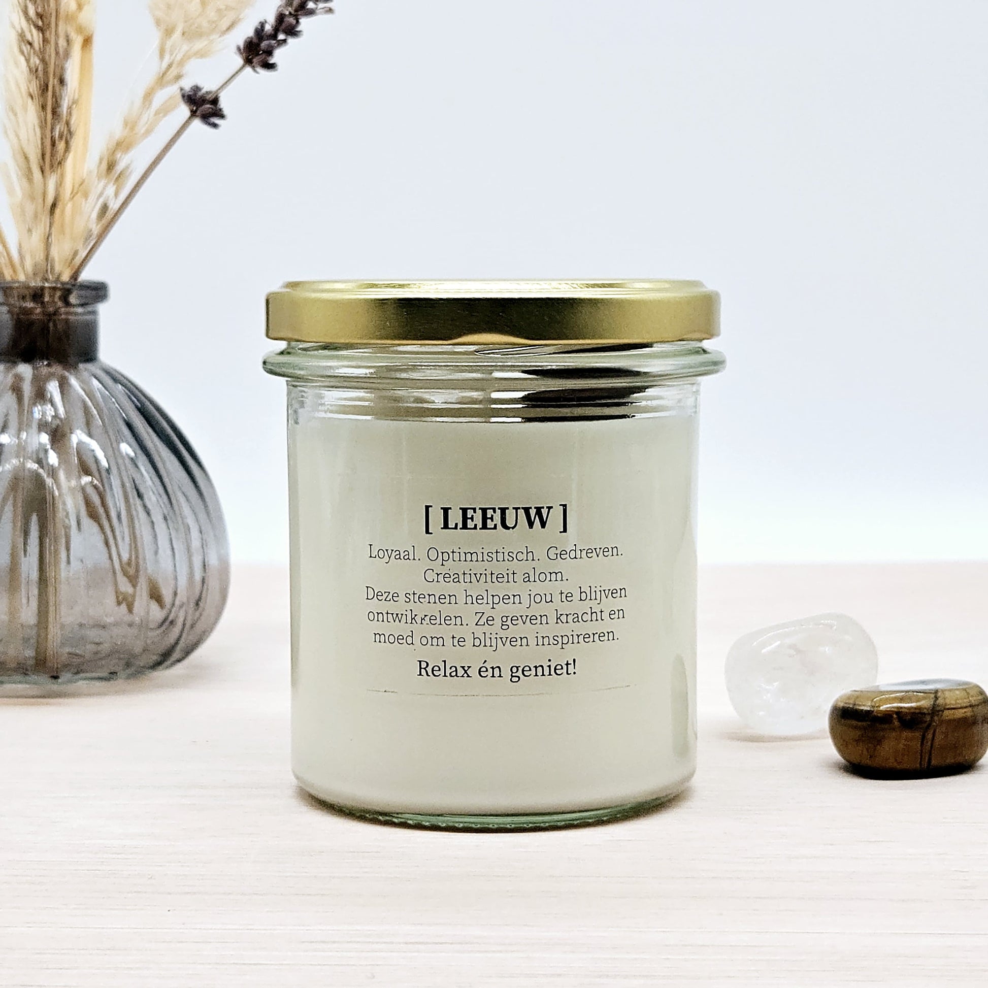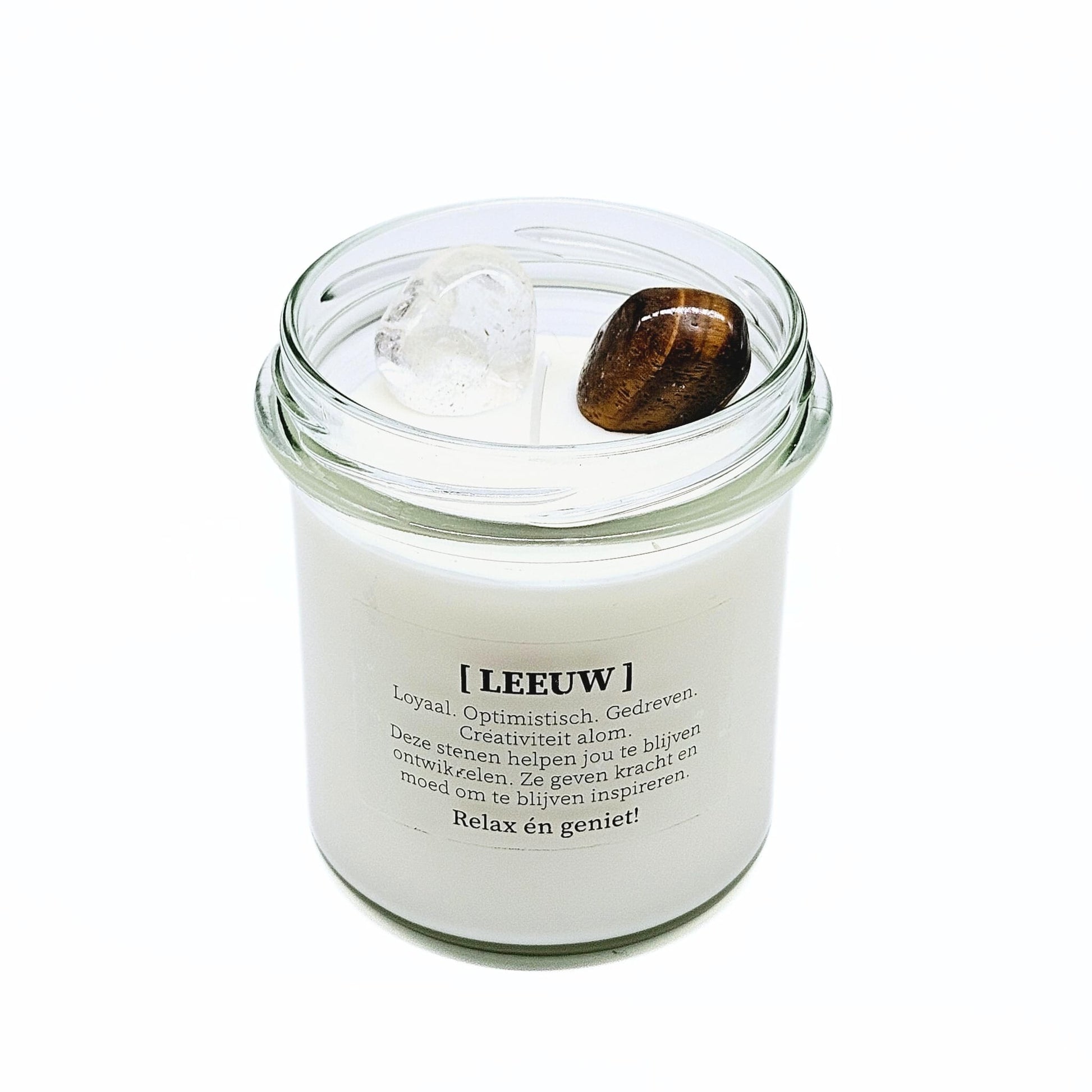 Deze geurkaars met edelstenen past bij jouw sterrenbeeld en is handgemaakt op basis van etherische olie en natuurlijke sojawas.