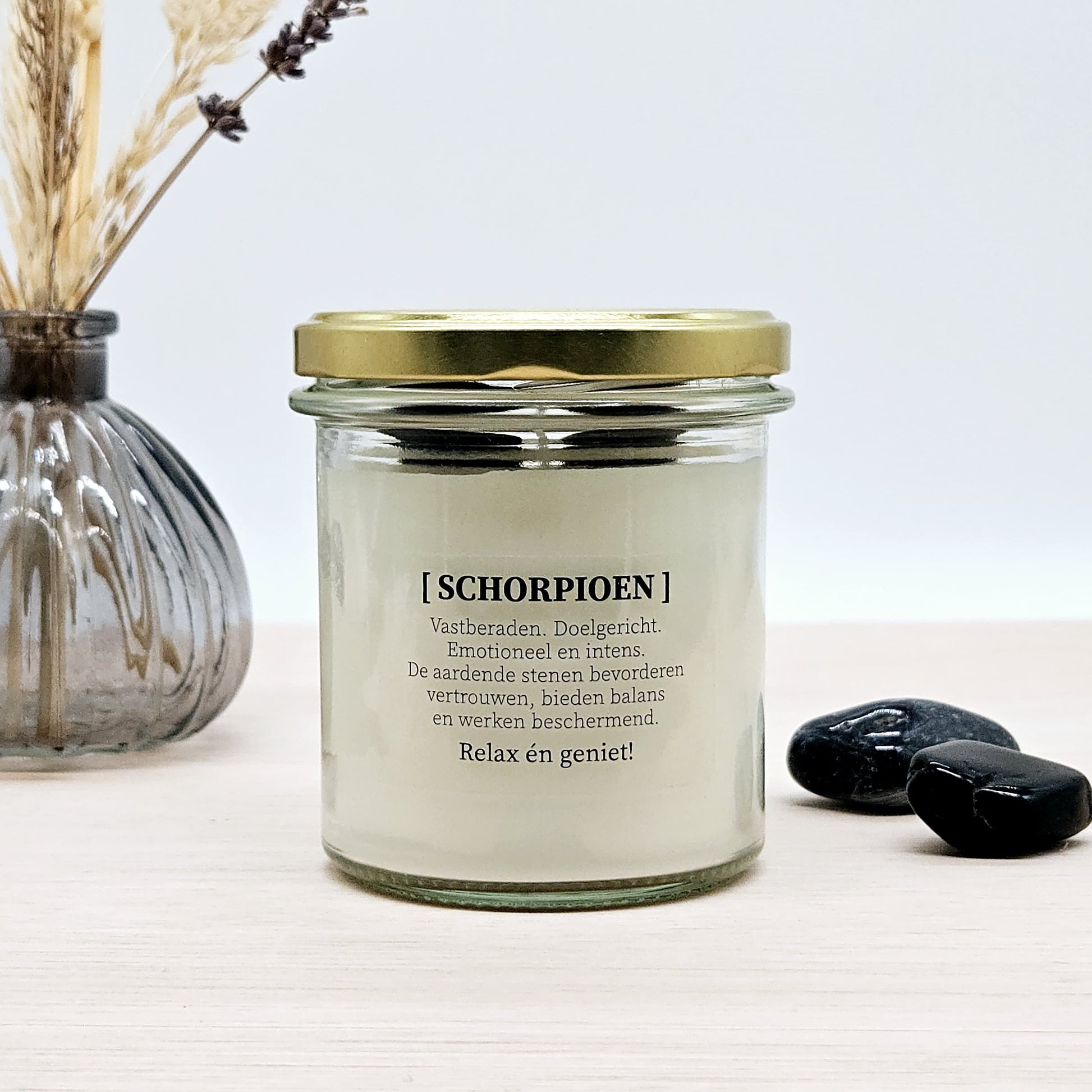 Deze geurkaars met edelstenen past bij jouw sterrenbeeld en is handgemaakt op basis van etherische olie en natuurlijke sojawas.