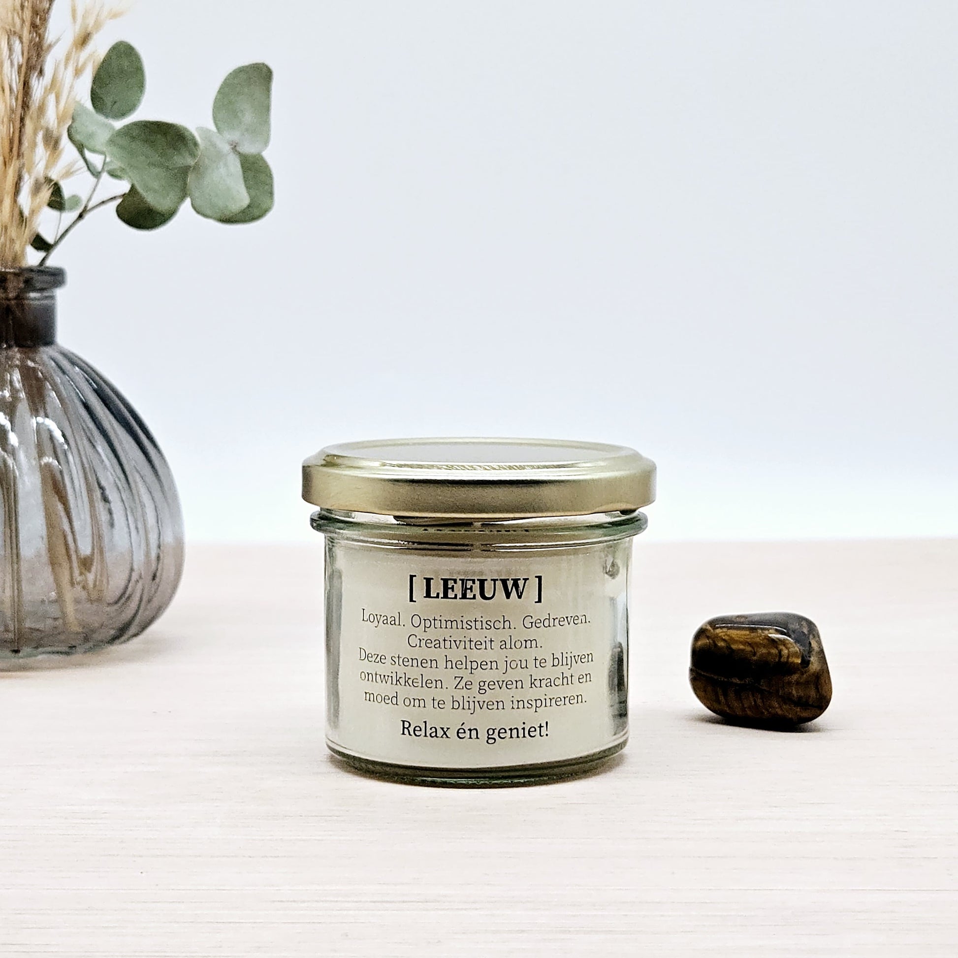 Deze geurkaars met edelstenen past bij jouw sterrenbeeld en is handgemaakt op basis van etherische olie en natuurlijke sojawas.