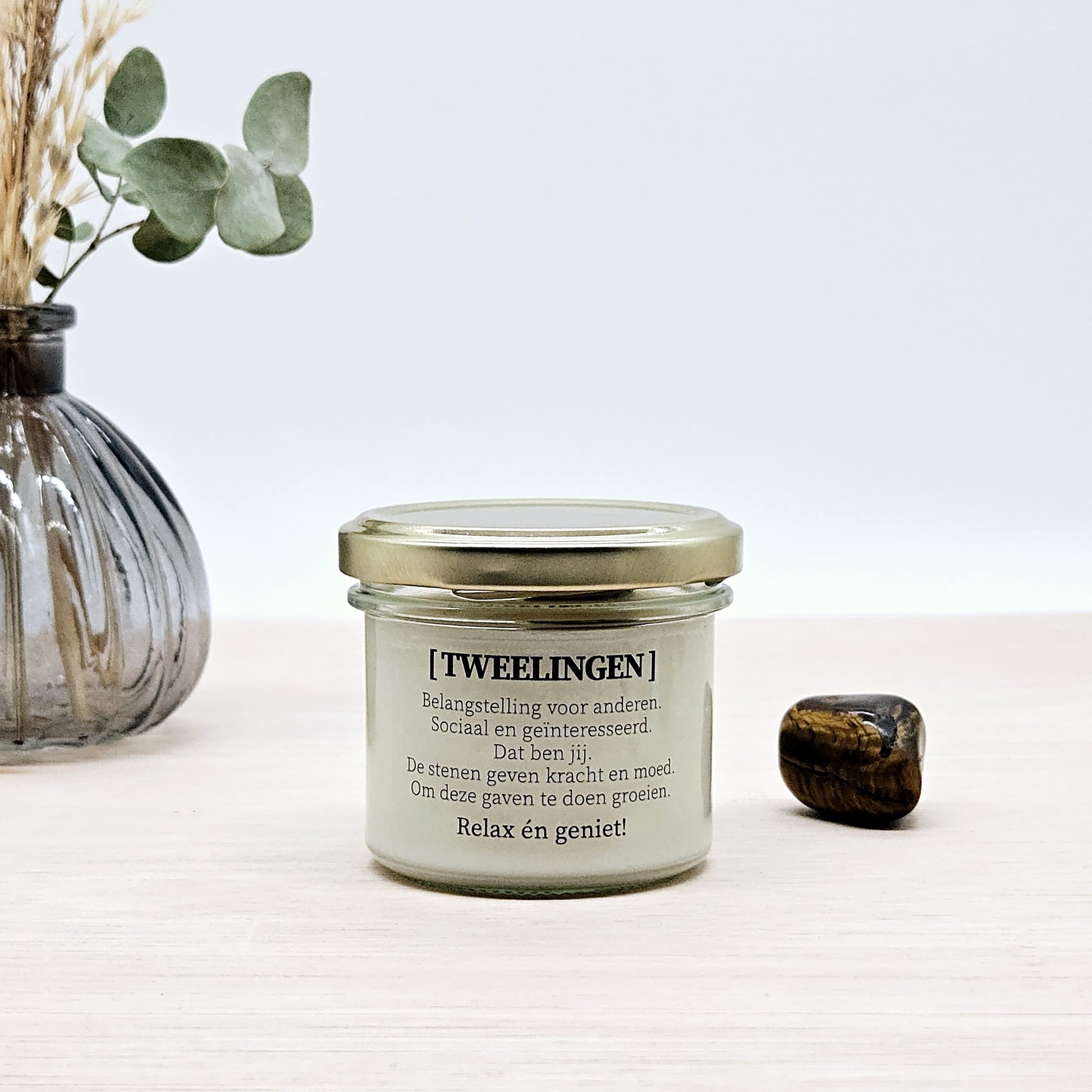 Deze geurkaars met edelstenen past bij jouw sterrenbeeld en is handgemaakt op basis van etherische olie en natuurlijke sojawas.